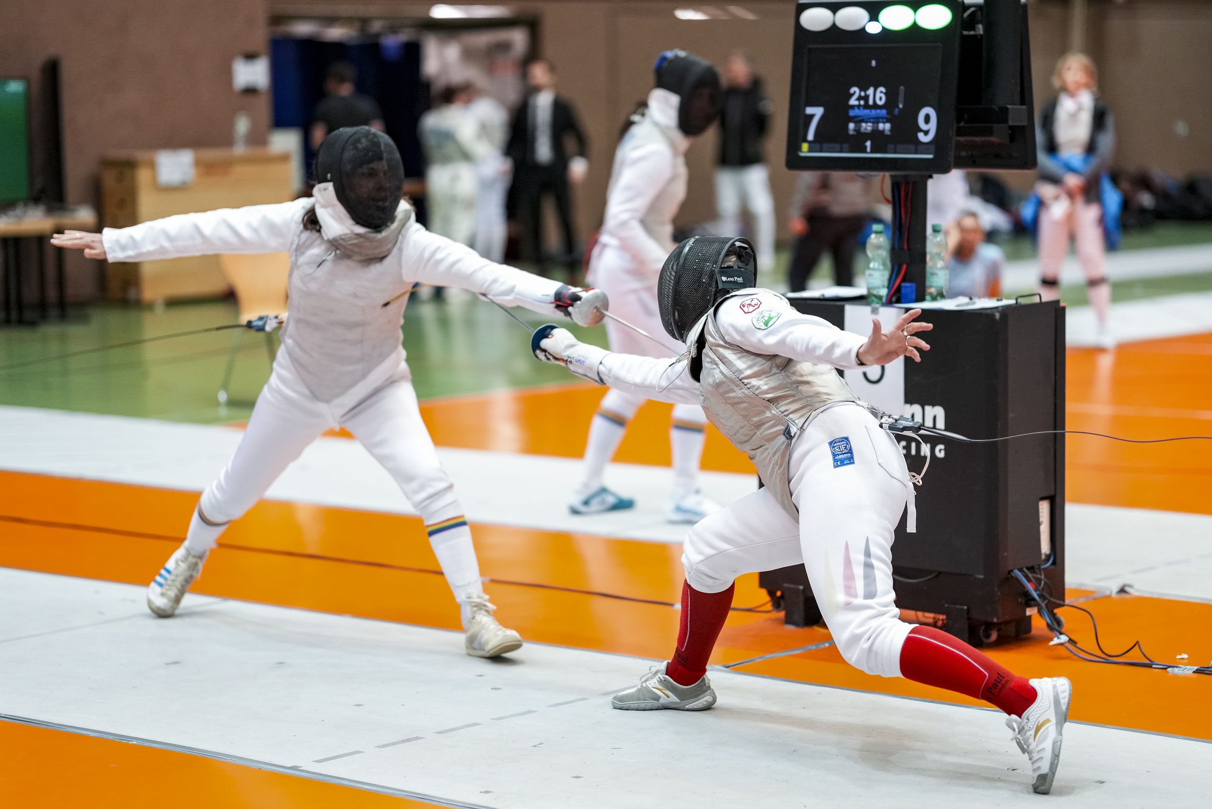 Am 2.Tag starteten die MTG-Damen im Florett, der Waffe, in der im Verein standardmäßig ausgebildet wird. Almut Haag, die ihr erstes KO in der AK40+ gegen eine Fechterin aus Essen mit 10:3 abgeben musste, schloss auf Platz 18 ab. In den Vorrunden der AK50+ starteten Eva Konrad und Barbara Math. Während Konrad als Turnier-Neueinsteigerin mit jedem gesetzten Treffer zufrieden war und nach dem KO gegen die Ranglistenfünfte auf Platz 10 endete, änderte Math schon in der Vorrunde nach zwei verlorenen Gefechten ihre Taktik auf Angriff und konnte so mit zwei Siegen noch das Freilos fürs 16er- Tableau erkämpfen. Im KO auf Platz 6 gesetzt, musste sie gegen die Drittplatzierte antreten, eine Linkshänderin vom OSC Berlin. Mit Entschlossenheit setzte Math die ersten Treffer, ihre Gegnerin konnte jedoch immer wieder aufholen und zum Ende der ersten Halbzeit hatte Math nur einen Treffer Vorsprung. Nach obligatorischer Gefechtspause setzte Math energisch vorwärts fort, um schließlich beim Gefechtsstand von 7:9 den finalen Einzeltreffer im Angriffsrecht zum 7:10-Sieg zu setzen. Damit erkämpfte sie sich die Bronzemedaille der Deutschen Veteranenmeisterschaft im Damenflorett in der AK50+. Die Freude über diesen Sieg war natürlich riesengroß, zumal Math im Vorrundengefecht gegen diese Berliner Fechterin unterlegen war.