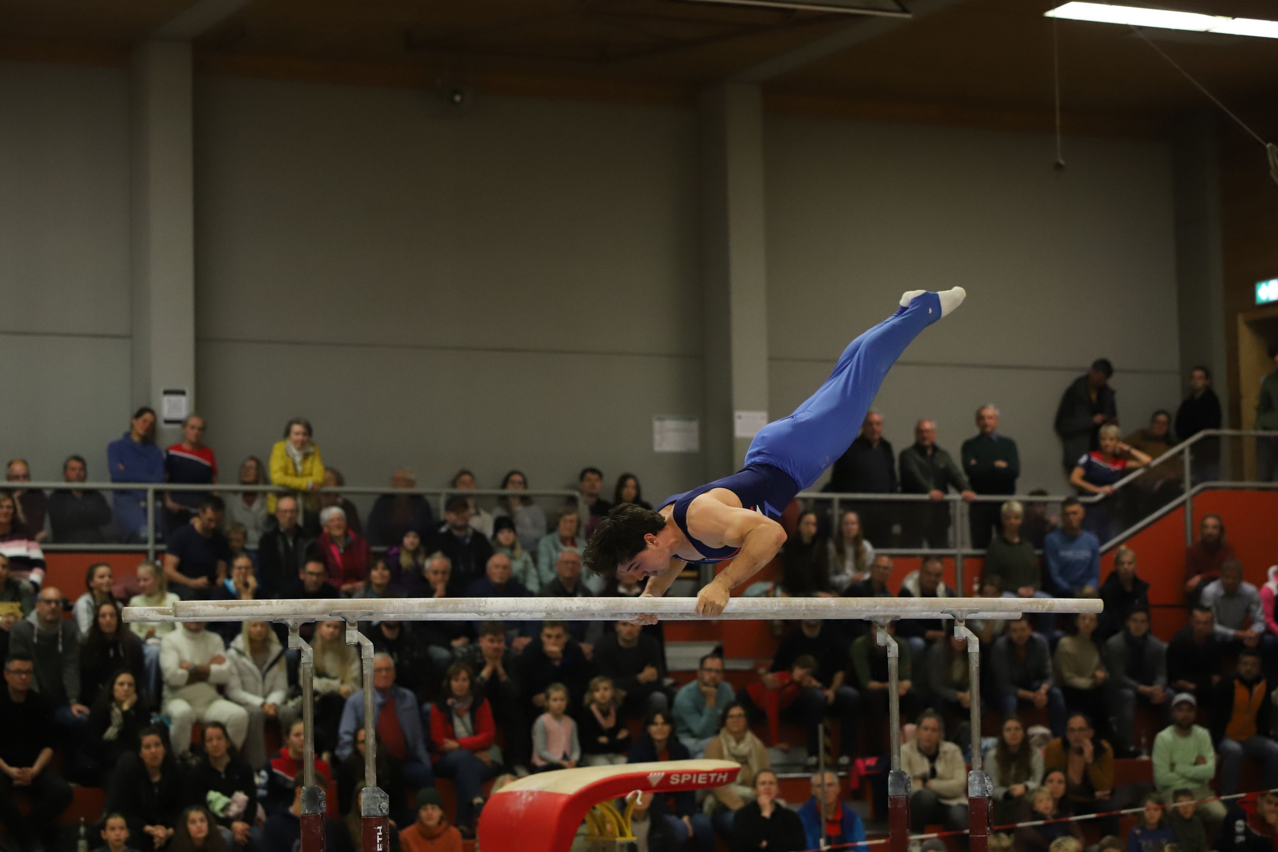 kurzerhand einen Doppelsalto vorwärts ans Ende seiner Übung packte und diesen überragend in den