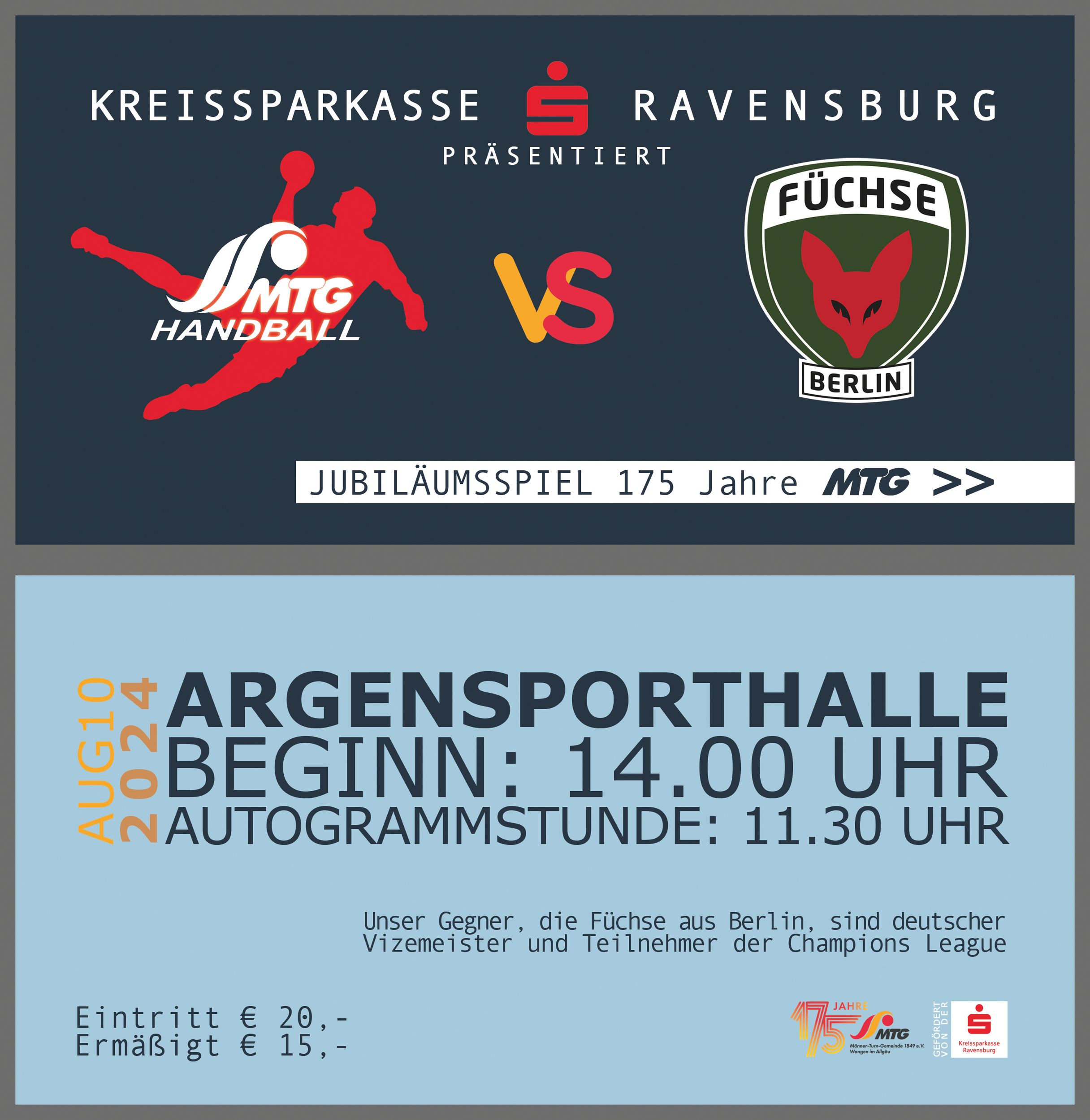 Die MTG Handballer bestreiten anlässlich unseres 175-jährigen Vereinsjubiläums ein Freundschaftsspiel gegen den Deutschen Vizemeister und Champions League Teilnehmer die Füchse Berlin.